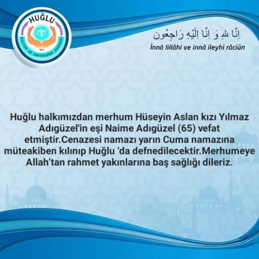 ALLAH RAHMET EYLESİN NAİME ADIGÜZEL VEFAT ETTİ![]() ![]() 29 OCAK 2026 Huğlu'da ikamet etmekte olan Naime Adıgüzel(Yılmaz Adıgüzel eşi Hakk'ın rahmetine kavuşmuştur. Allah rahmet eylesin mekanı cennet olsun Geride kalan yakınlarına Allah sabırlar versin. Merhumenin cenazesi 30.01.2026 Cuma günü cuma namazına mütakip Huğlu mezarlığına defnedilecektir. |